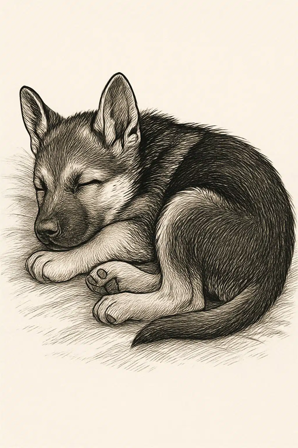 The sleeping German Shepherd pup coloring page captures the dog in a calm and restful pose. It shows the pup lying down peacefully, which helps create a soothing image for coloring.