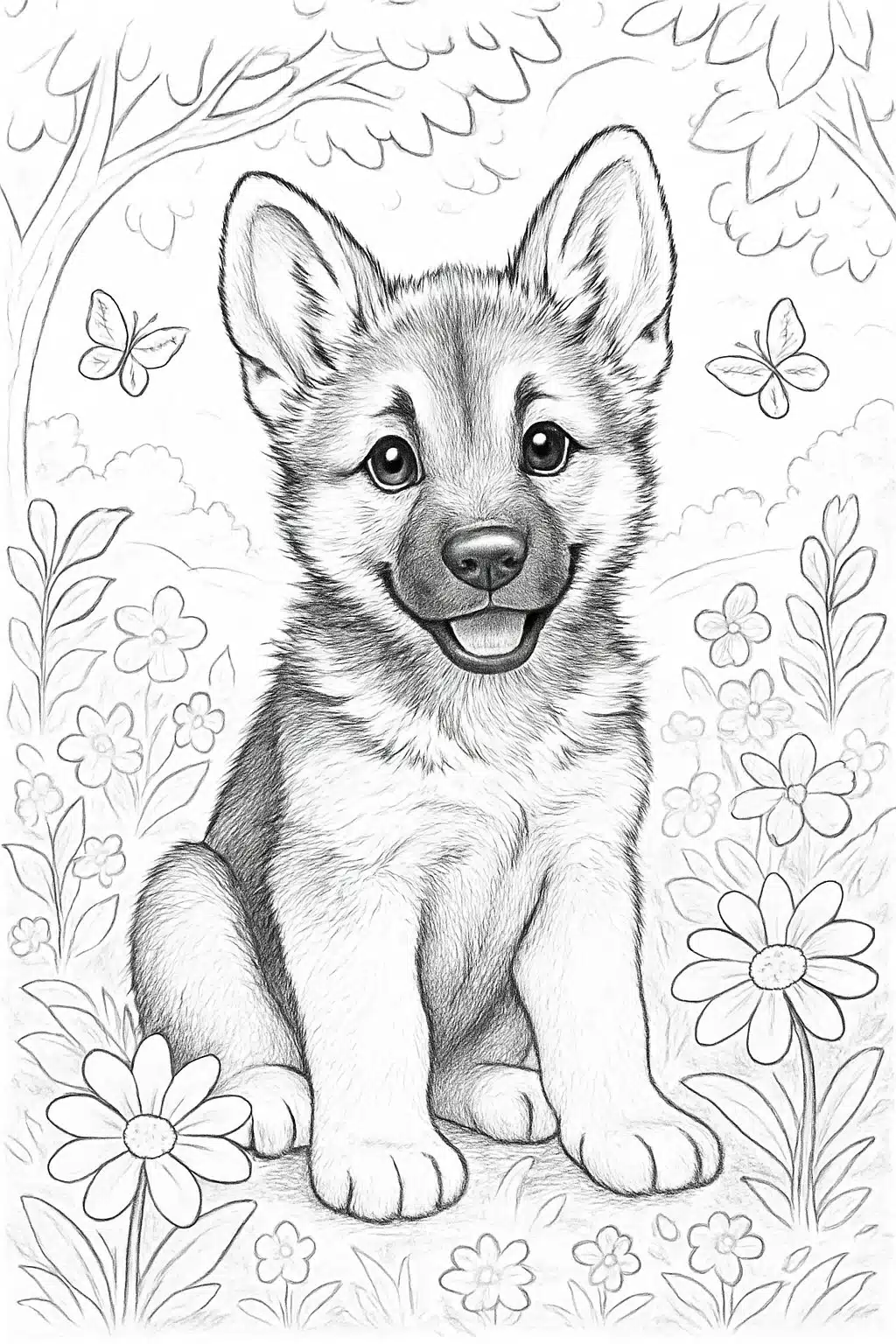 This coloring page shows a German Shepherd puppy in a garden setting. The puppy looks curious and lively among flowers and plants.