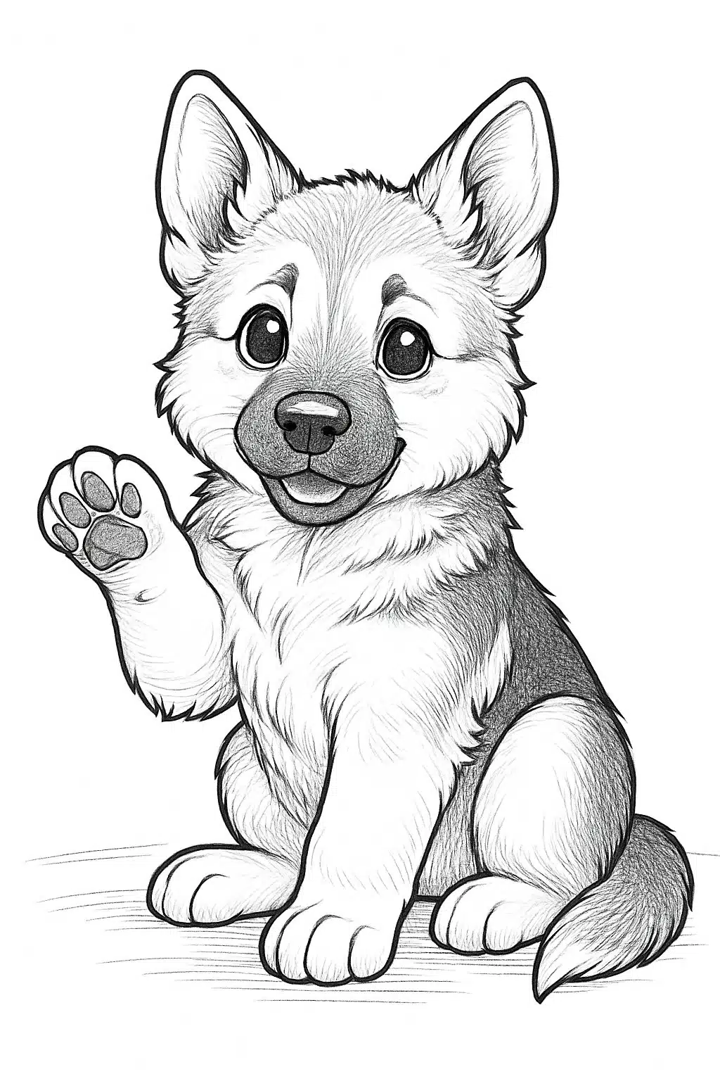 The puppy with its paw raised is a classic pose in German Shepherd coloring pages. This stance shows curiosity and playfulness. It gives the image a lively and friendly feel.