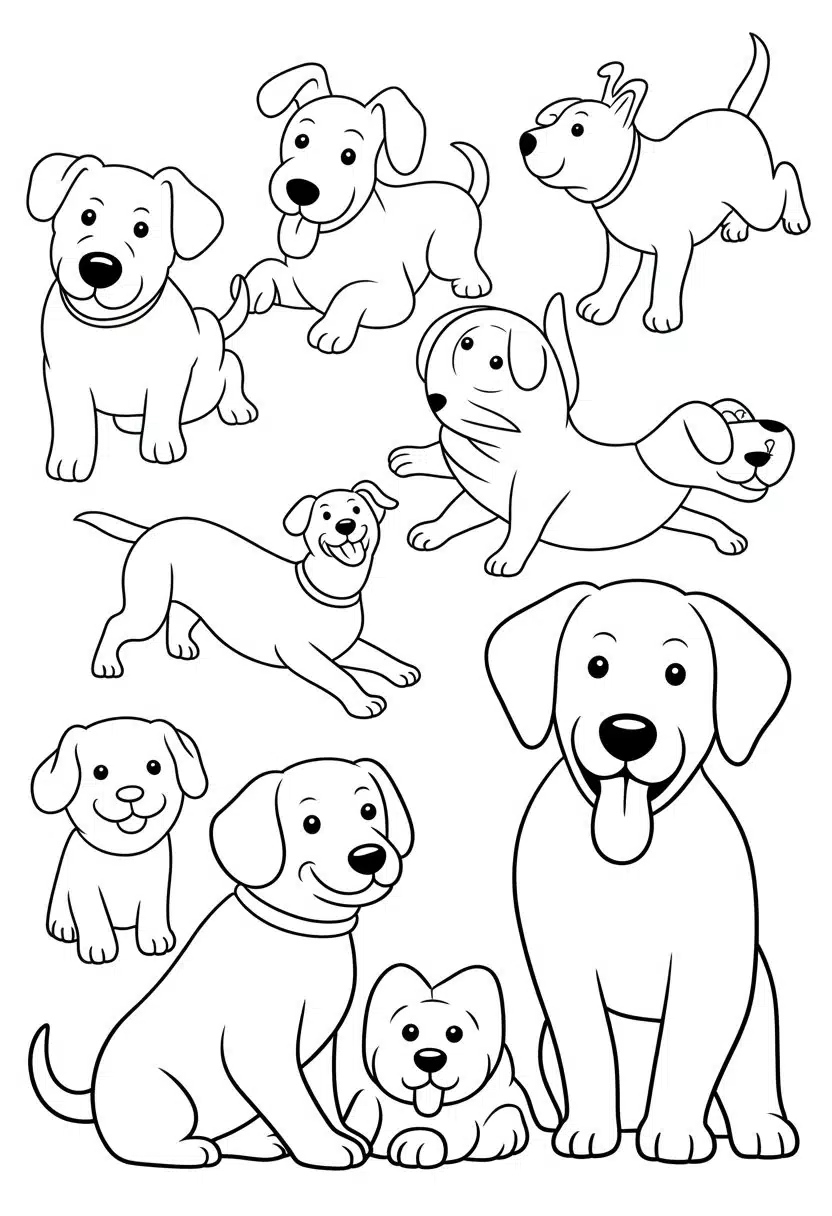 This collection offers 50 high-definition puppy coloring pages. It includes various breeds like Golden Retrievers, Huskies, and Pugs. Each page is clear and easy to print for coloring. They suit both kids and adults who enjoy simple, detailed designs.