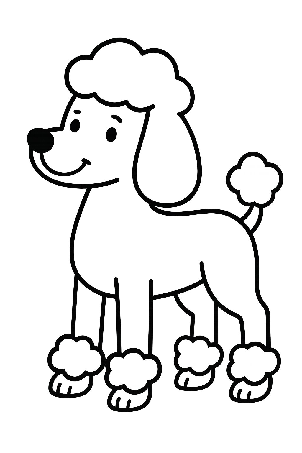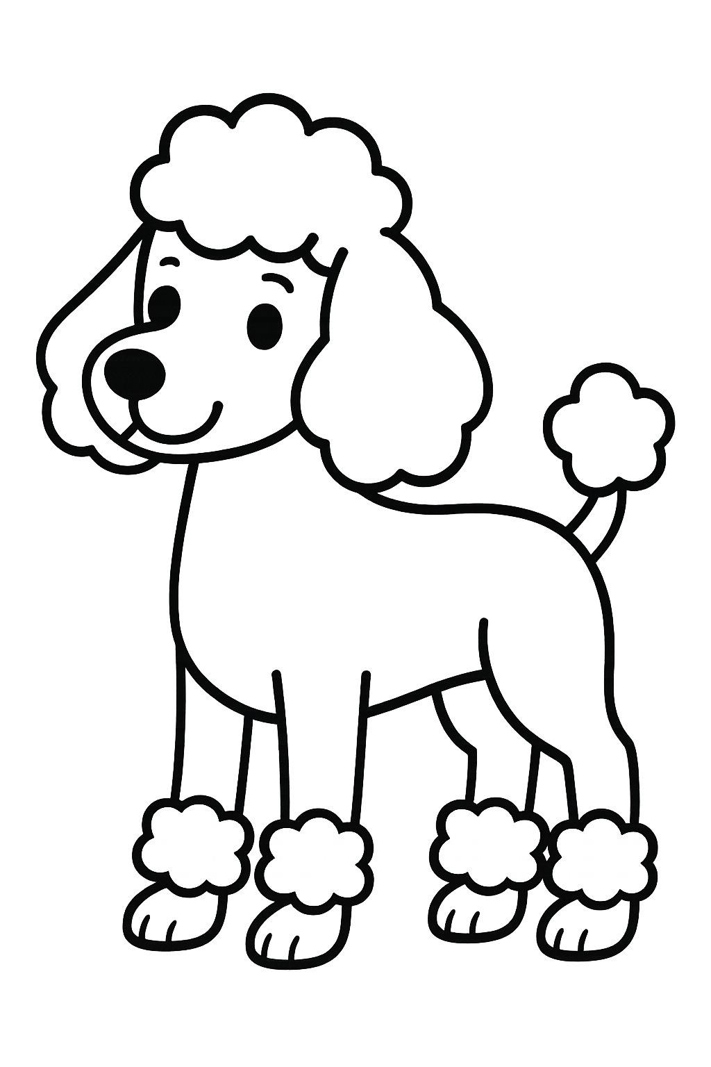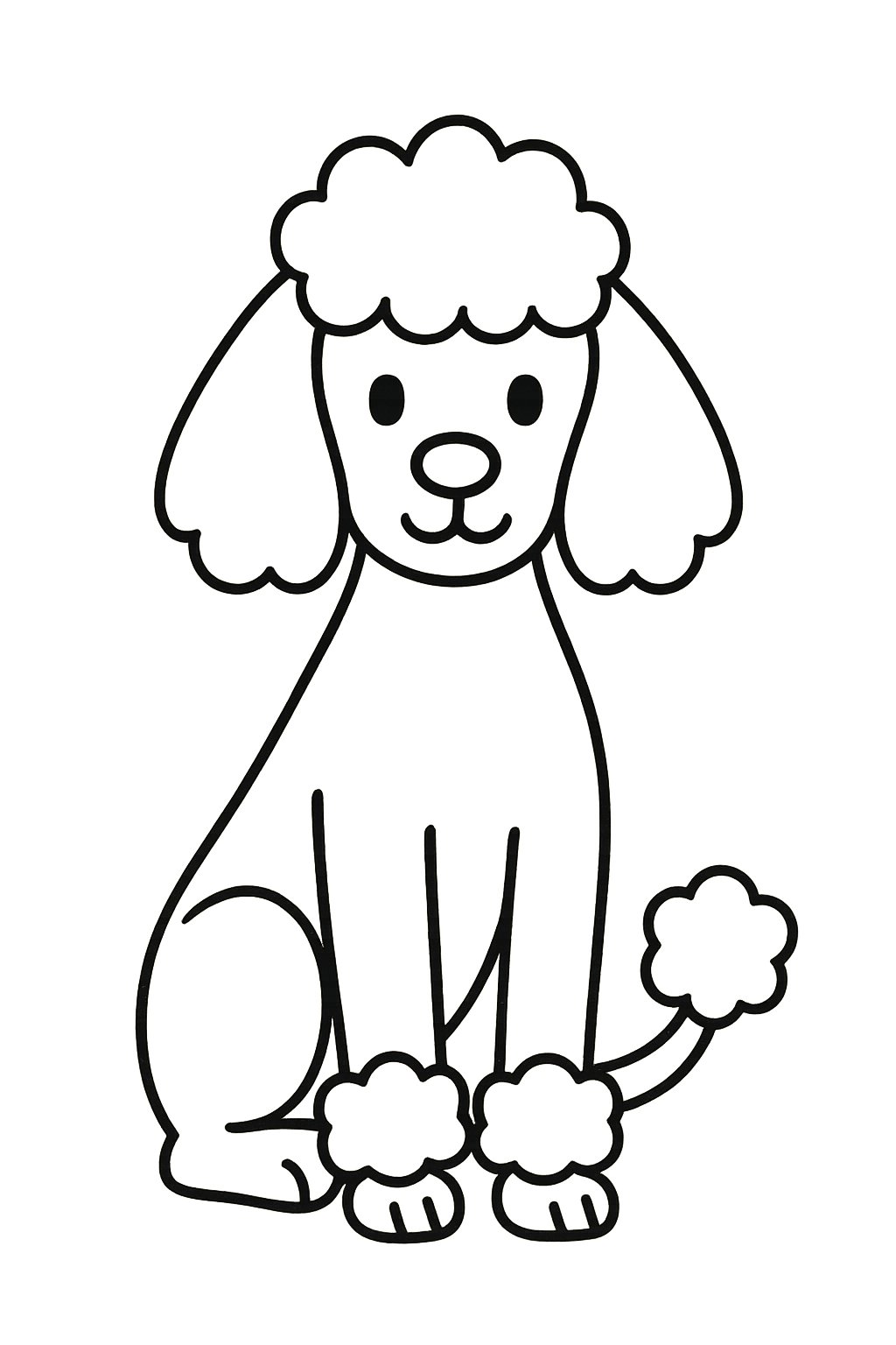 The outline should highlight the poodle’s distinct fluffy tail and legs. Soft, rounded curves can show the trimmed fur typical of the breed. This detail helps capture the poodle’s unique grooming style and adds character to the drawing.